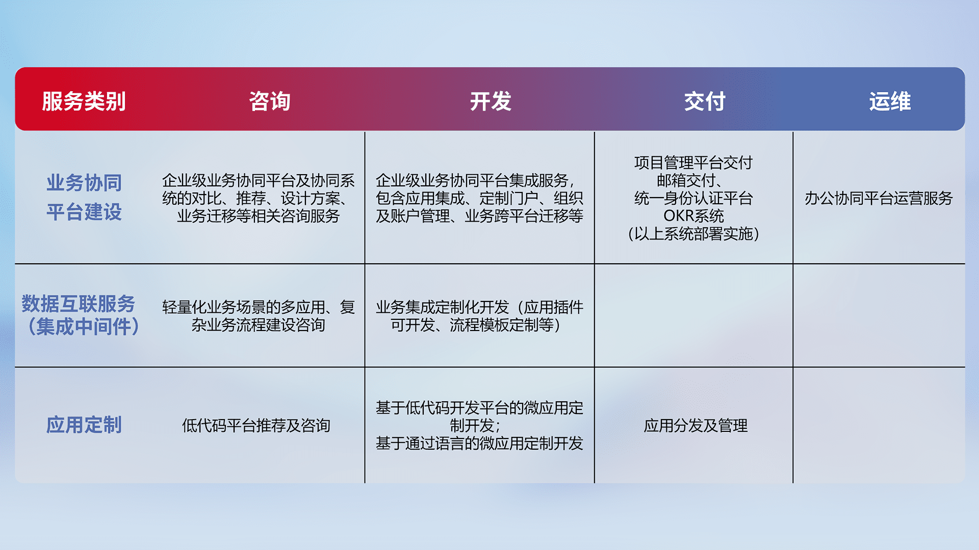 针对钉钉、、、企微、、IDaas等平台级产品提供产品的规划、、、、方案、、、交付、、定制化开发等服务,,,实现如统一协同办公、、、智能客户服务、、、、混合会议管理、、、、智能数据查询、、、、等业务场景,,,,实现数字化转型。。。