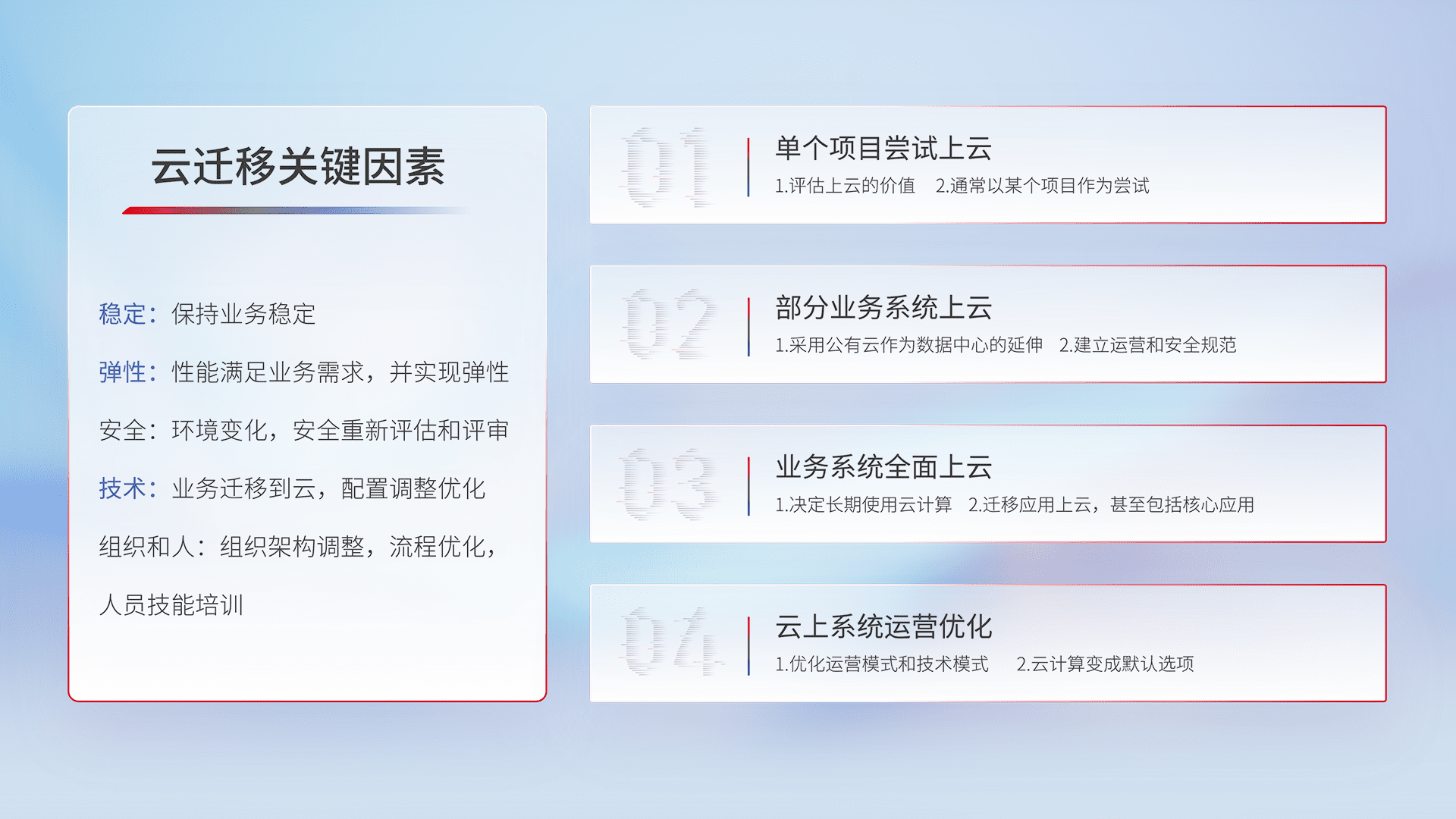 结合实际业务,,从规划设计、、、、云平台选型、、、、云原生改造、、、数据迁移、、、集成交付,,,迁移全过程为客户识别最佳上云路径,,,做好风险识别管理,,设计网络架构、、、身份权限、、安全审计合规、、操作审计、、、、日志审计、、、监控告警策略、、多站点容灾设计等,,,,对云上基础设施进行整体规划,,提升IT治理水平,,以满足弹性、、、、高可用、、、高性能的需求。。。
