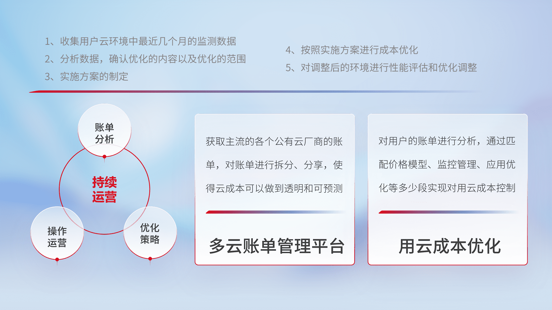 通过多云纳管,,以统一的资源数据模型把客户的云资源进行抽象和封装,,进而实现对多云资源的统一操作,,保障云资源管理的可靠性、、稳定性与可用性。。。量身定制化运维内容,,,,配置、、、、开发运维、、、、补丁管理、、备份、、、、监控、、、认证和访问管理、、、、审计和日常巡检等,,保障在用云过程中的可靠度,,,,稳定度以及高可用率。。。